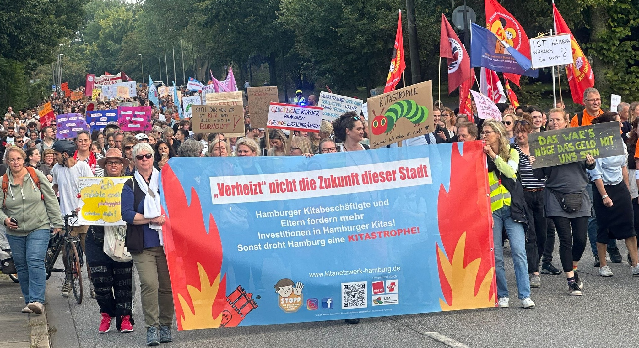 In Hamburg gibt es ein Netzwerk aus Fachkräften und Eltern, was unter anderem durch die beiden Gewerkschaften ver.di und GEW unterstützt wird und sich aufgrund der Situation in den Kitas gegründet hat. Dieses Netzwerk hatte für Mitte September zu einer Demonstration unter dem Titel „Hamburg droht die KITASTROPHE!“ aufgerufen. Als wir, zwei Erzieher-Auszubildende, von dieser Demonstration erfuhren, war für uns schnell klar, dass wir uns daran beteiligen müssen. Denn gerade wir als Auszubildende, die fast ihr ganzes Berufsleben noch vor sich haben und direkt auf die katastrophalen Arbeitsbedingungen in den KITAs und sozialen Einrichtungen zusteuern, haben nun eine spezielle Rolle und müssen in den Einrichtungen und an der Berufsschule auf diese Themen aufmerksam machen. Um die prekäre Situation für uns, die Beschäftigten, aber auch für die Kinder zu verbessern, müssen wir uns zusammenschließen, was es für uns notwendig gemacht hat, mit unseren Mitschülerinnen und Mitschülern in den Austausch zu kommen und einen starken Auftritt von Auszubildenden auf der Demonstration zu erreichen.