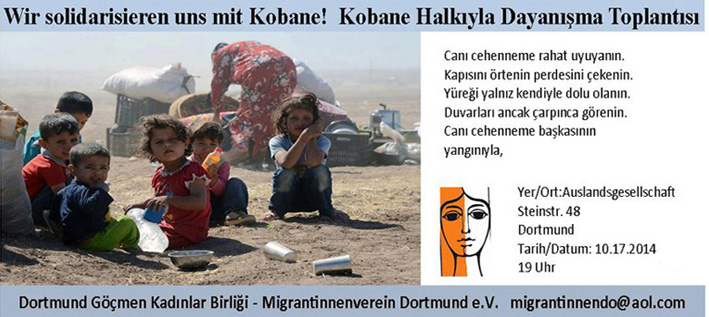 Kobanê ile kadın dayanışması kapsamında başlatılan kız kardeşlik köprüsüne bir destek de Almanya’dan geldi. Göçmen Kadınlar Birliği’ne bağlı Dortmundlu kadınların topladığı yardımları kadın birliği adına Zeynep Sefariye Ekşi, Suruç Belediye Eş Başkanı Zuhal Ekmez’e ulaştırdı. Savaşlarda en çok kadın ve çocukların zarar gördüğünü ifade eden Ekşi, yaptıkları çalışmalar hakkında bilgi vererek, “Kurulan kız kardeşlik köprüsünü büyütmeye de devam edeceğiz” dedi. Ekşi, Göçmen Kadınlar Birliği üyelerinin Kobanêli kadınlara yazdığı bir mektubu da iletti. Ekmez de Kobanê için kadın dayanışmasının oldukça önemli olduğunu ifade ederken, Kobanê’de bir kadın devrimi yaşandığını söyledi. (Suruç/EVRENSEL)